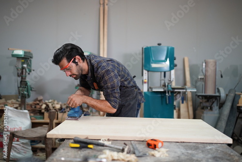 Contemporary Carpenter Working, Portrait of modern carpenter making wood furniture while working in joinery lit by sunlight with factory background on small business concept, copy space