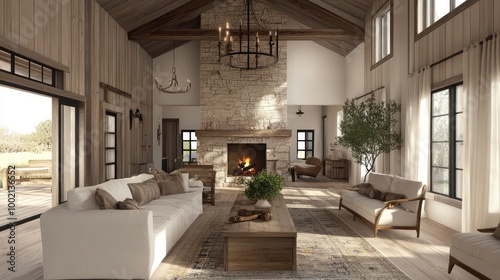 Contemporary farmhouse living room with reclaimed wood, cozy neutral tones, and a large stone fireplace.