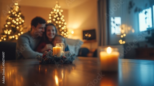 Contemporary frame on table, blurred family in living room, warm, inviting atmosphere, depth of field
