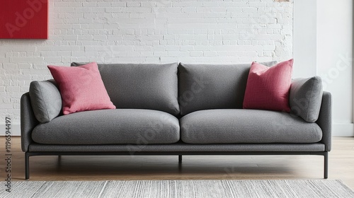 Contemporary, furniture and bold, A modern gray sofa with pink cushions, set against a white wall, creating a stylish and inviting living space.