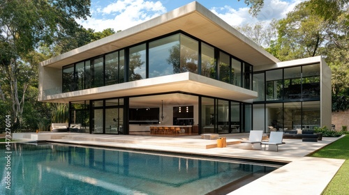 Contemporary geometric home design with poolside oasis and surrounding landscape
