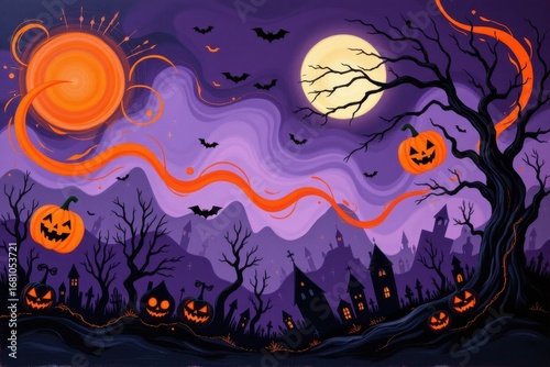 contemporary halloween painting using bold orange swirls, soft purple mist, black jagged shapes, balanced asymmetry conveying abstract modern spooky aesthetic.