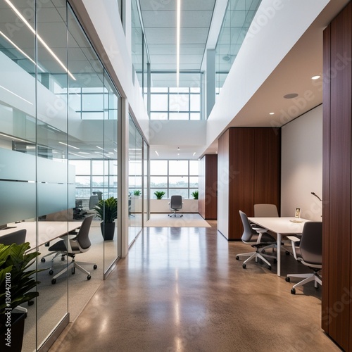 Contemporary High-Ceiling Corporate Office with Sleek Design, Open Layout, and a Professional Work Environmen