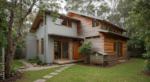 Contemporary home nestled amidst lush greenery, embracing sustainable design