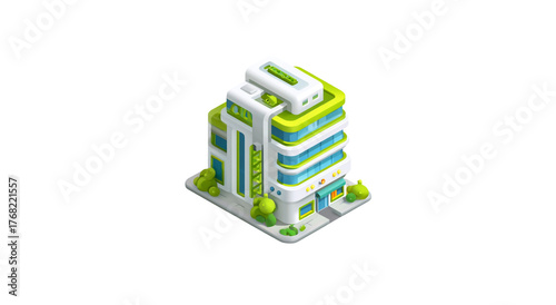 Contemporary isometric building with green and blue accents isolated on transparent background
