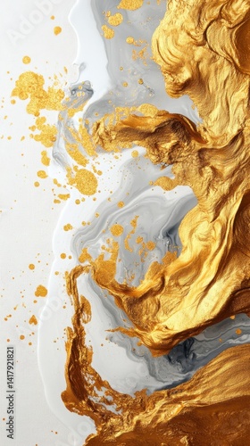 Contemporary Japanese Brushwork: Bold Gold Ink Swirls on White Canvas