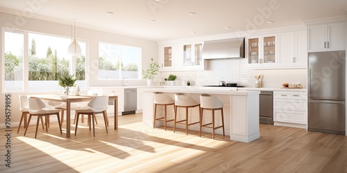 Contemporary kitchen with white cabinets and bright wood flooring.