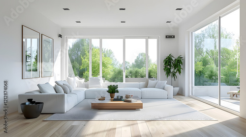 Contemporary living room interior with white walls and panoramic windows, minimalist design. generative ai.