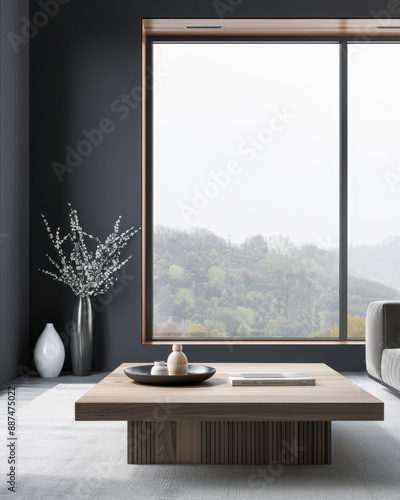 Contemporary living room interiors with minimalist furniture and neutral contrasting colors. Luxury realty composition with minimal furniture.
