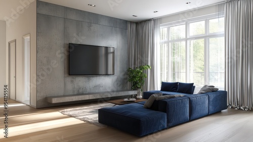 Contemporary living with a blue couch, minimalist concrete wall, and wood flooring.