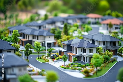 Contemporary miniature model of villas in a landscaped neighborhood for housing market concept