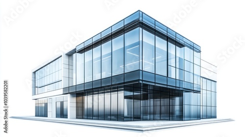 Contemporary office building with large glass windows and bold architectural lines, isolated on white background
