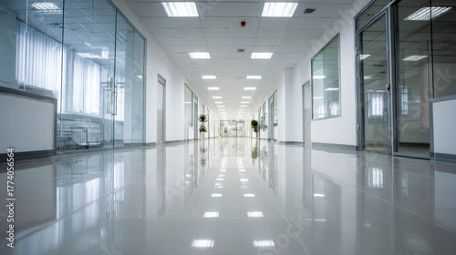 Contemporary office hallway features sleek polished floors, glass partitions, and greenery, enhancing the bright and open environment