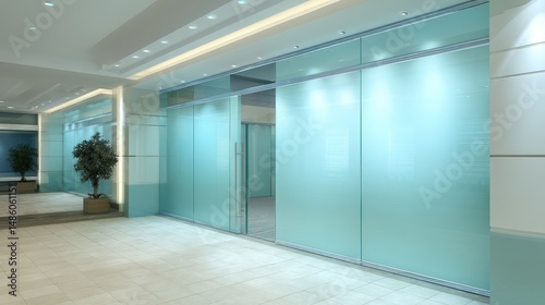 Contemporary office lobby with frosted glass walls reflecting soft ambient light, highlighting interior architecture and modern design aesthetics.