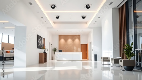 Contemporary office reception area with clean white walls and elegant architectural design.