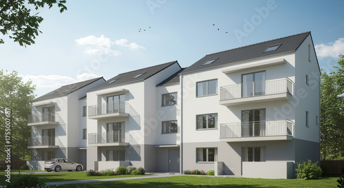 Contemporary residential complex with white façades and balconies in daylight