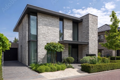 Contemporary residential home featuring distinctive architectural design and a beautifully landscaped garden, set in a charming suburban neighborhood on a bright, sunny day