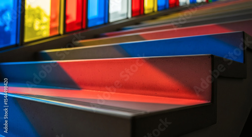 Contemporary Staircase Adorned with Vibrant Light Projections from Colorful Window Panels, Forming Dynamic Geometric Shadows and Abstract Designs on Each Step.