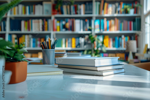 Contemporary Study Space: Books and Plant on a Modern Desk