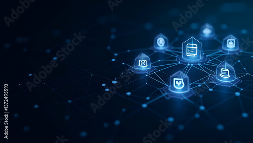 Contemporary Wallpaper Design: Digital Blockchain Grids & Minimalist Icons for Cross-Border Finance - Secure, Transparent Transactions in Modern Fintech with Ample Negative Space