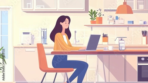 Contemporary workspace: Girl using laptop in a modern kitchen, digital lifestyle