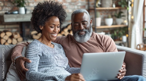 Content couple in a state of bliss, unwinding at their residence, cherishing each other's company while utilizing a computer, creating an intimate and genuine connection.