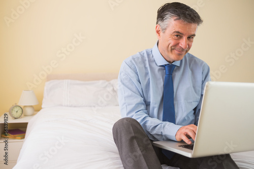 Content man using a laptop sitting on a bed