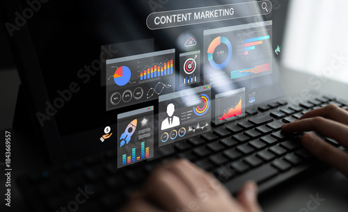 Content marketing interface with data dashboards, analytics charts, and content tools. Marketing success comes from content performance, content planning, and marketing optimization. Spline