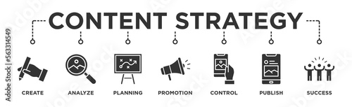 Content strategy banner web icon vector illustration concept with icon of create, analyze, planning, promotion, control, publish and success