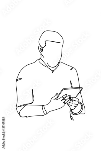 continuous line drawing of male standing work with his tablet computer. Dynamic technology and business concept single line graphic draw design vector illustration