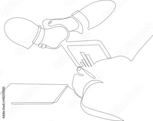 Continuous line drawing of a interview attractive executives man and woman asking questions to applicant about work history. One continuous line is the concept. Vector illustration
