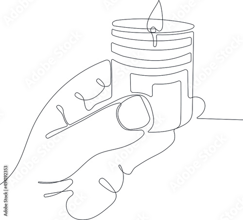 Continuous line drawing of candle in human hand, scented candles in spa salon. Vector illustration