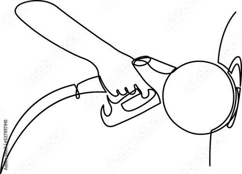 Continuous line drawing of hand holding refueling gun next to the car. Concept of refueling car at gas station. Vector illustration.