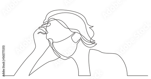 continuous line drawing vector illustration with FULLY EDITABLE STROKE - woman in depression wearing face mask