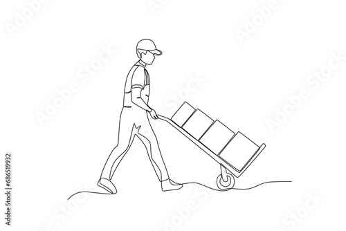 Continuous one line drawing An employee carrying a package to the warehouse. Single line draw design vector graphic illustration