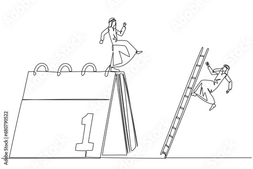 Continuous one line drawing Arab businessman kicks opponent who is climbing a desk calendar with a ladder. Vacations will be canceled due to many deadlines. Single line draw design vector illustration