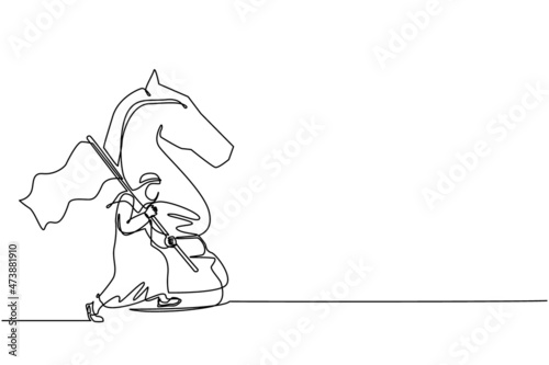 Continuous one line drawing Arabian businessman running and holding flag beside big horse knight chess. Business achievement goal, metaphor concept. Single line draw design vector graphic illustration