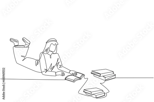 Continuous one line drawing Arabian man really likes reading. Everyday one book is read. Good habit. There is no day without reading book. Book festival concept. Single line design vector illustration