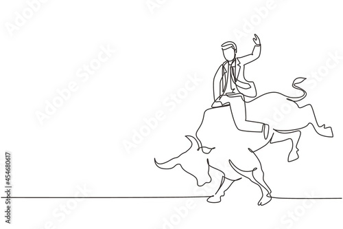 Continuous one line drawing businessman riding unicorn bull. Investment, bullish stock market trading, rising bonds trend. Successful business man. Single line draw design vector graphic illustration
