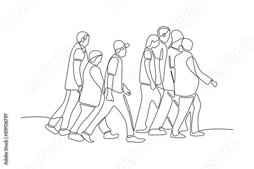 Continuous one line drawing concept of a crowd of happy people outdoors. Single line draw design vector graphic illustration.