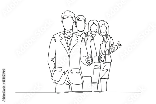 Continuous one line drawing group of line up young happy businessmen standing up together and giving thumbs up gesture. Business teamwork concept. Single line draw design vector graphic illustration