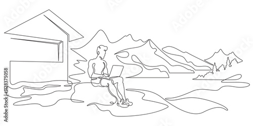 Continuous one line drawing handsome man with laptop.Athletic man working remotely on computer in nature in summer.Beautiful landscape. One continuous line isolated minimal illustration.Not AI.