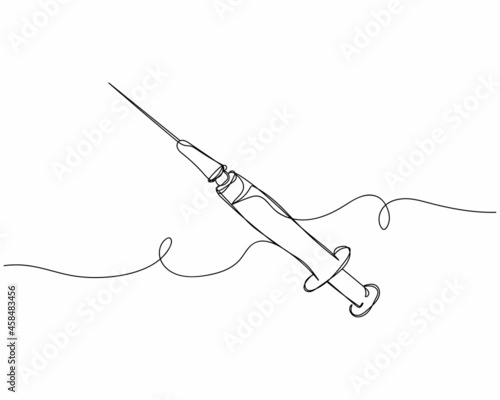 Continuous one line drawing of disposable syringe with needle and medicine in silhouette on a white background. Linear stylized.Minimalist.