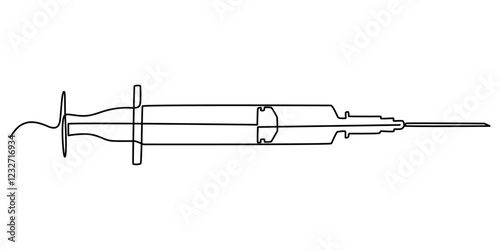 Continuous one line drawing of medical syringe. One line drawing illustration of injection syringe. Vaccine, World health day concept Single line. Editable outline, Continuous Line Drawing of Vaccine.