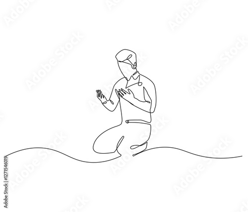 Continuous one line drawing of muslims prayer. Single line drawing illustration of Muslim person sitting and praying. Ramadan kareem concept vector art. Doodle line illustration.