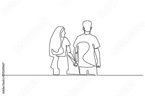 Continuous one line drawing of young Couple Walking Together. Single line drawing illustration of romantic back view couple holding hands. Romance concept vector art. Doodle line illustration.