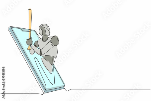 Continuous one line drawing robot come out from cellular phone with baseball player pose. Humanoid robot cybernetic organism. Future robotic development concept. Single line draw design vector graphic