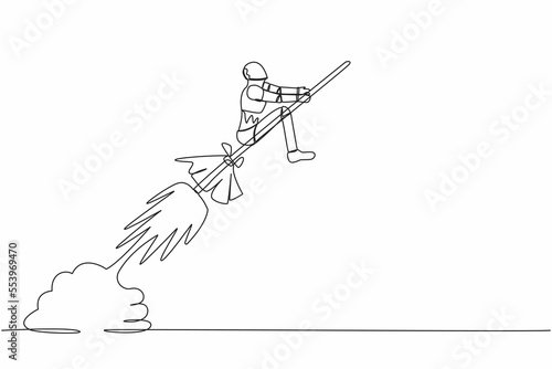 Continuous one line drawing robot riding broom rocket flying in the sky. Tech company launch. Humanoid robot cybernetic organism. Future robot development. Single line draw design vector illustration