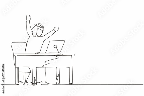 Continuous one line drawing winning online working technology concept. Arabic businessman stands in office with hand raised opposite computer screen celebrating success. Single line draw design vector