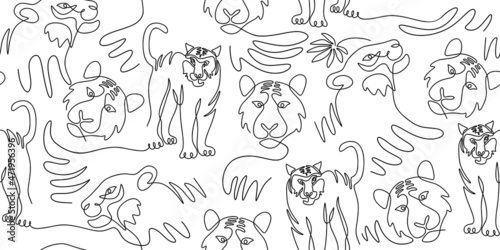Continuous one line of tiger isolated on seamless pattern and white background.